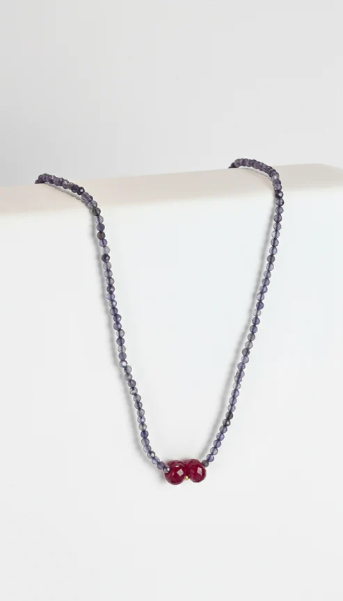 Colar com Iolita, 2 Rubis e 1 esfera em Ouro amarelo 18k. Comprimento: 40cm.