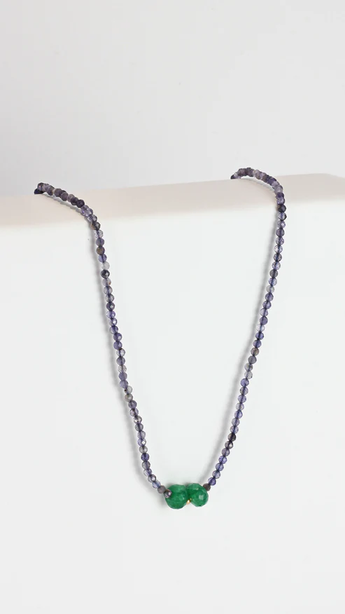 Colar com Iolita, 2 Esmeraldas e 1 esfera em Ouro amarelo 18k. Comprimento: 40cm