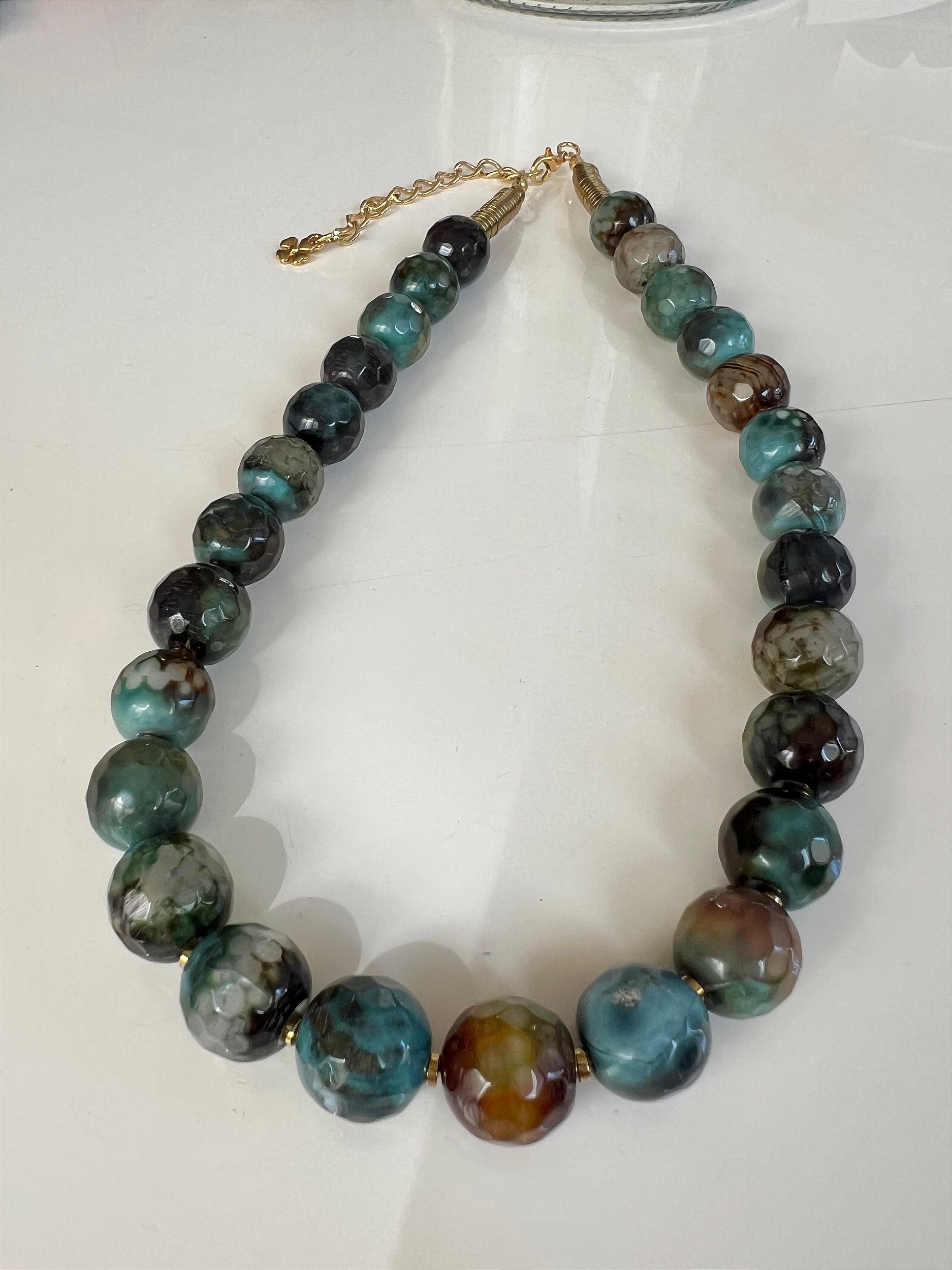 Colar em Ágatha verde mesclada e facetada com Hematitas douradas.