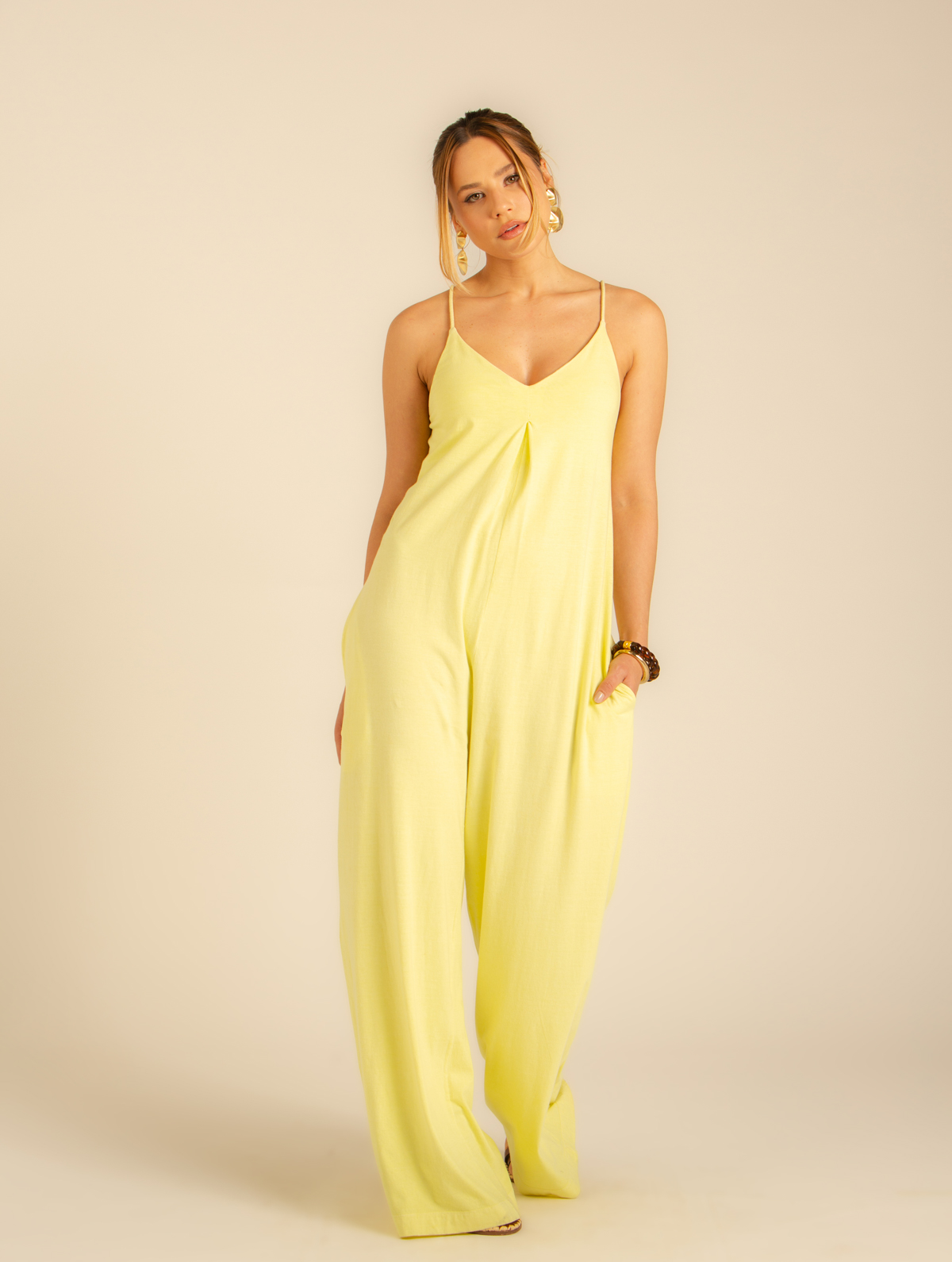 O Macacão Energia é confeccionado em Malha 100% algodão. O Macacão possui alça em cordão de algodão tinturado na cor, prega frontal, forro interno na altura do busto e bolsos laterais. Acompanha cinto torcido de algodão tinturado.