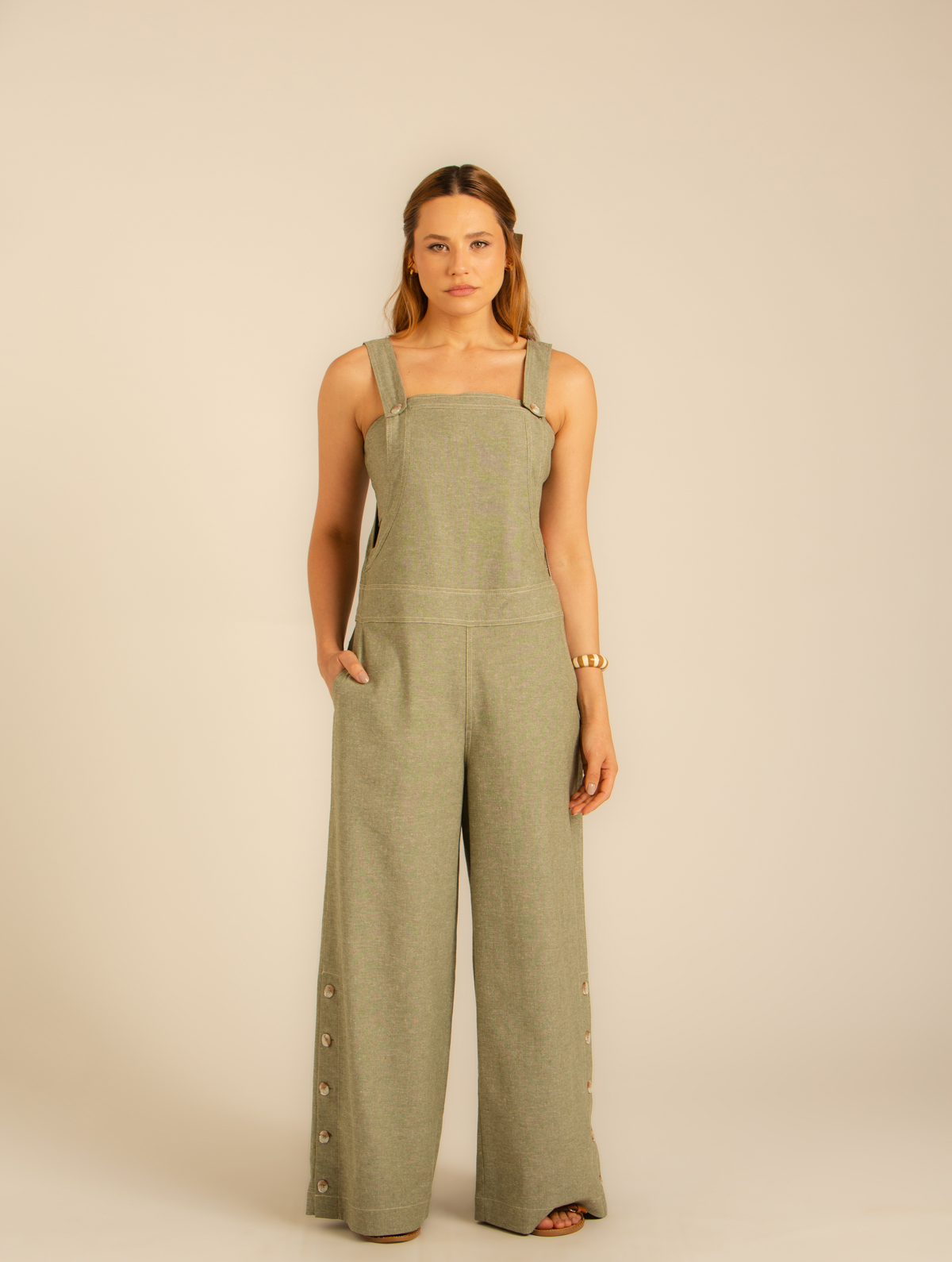 O Macacão Sensatez é confeccionado em Linho Misto. O Macacão possui alça e abotoamento, zíper metal lateral, bolsos faca e abertura nas laterais das pernas com fechamento em botões.
