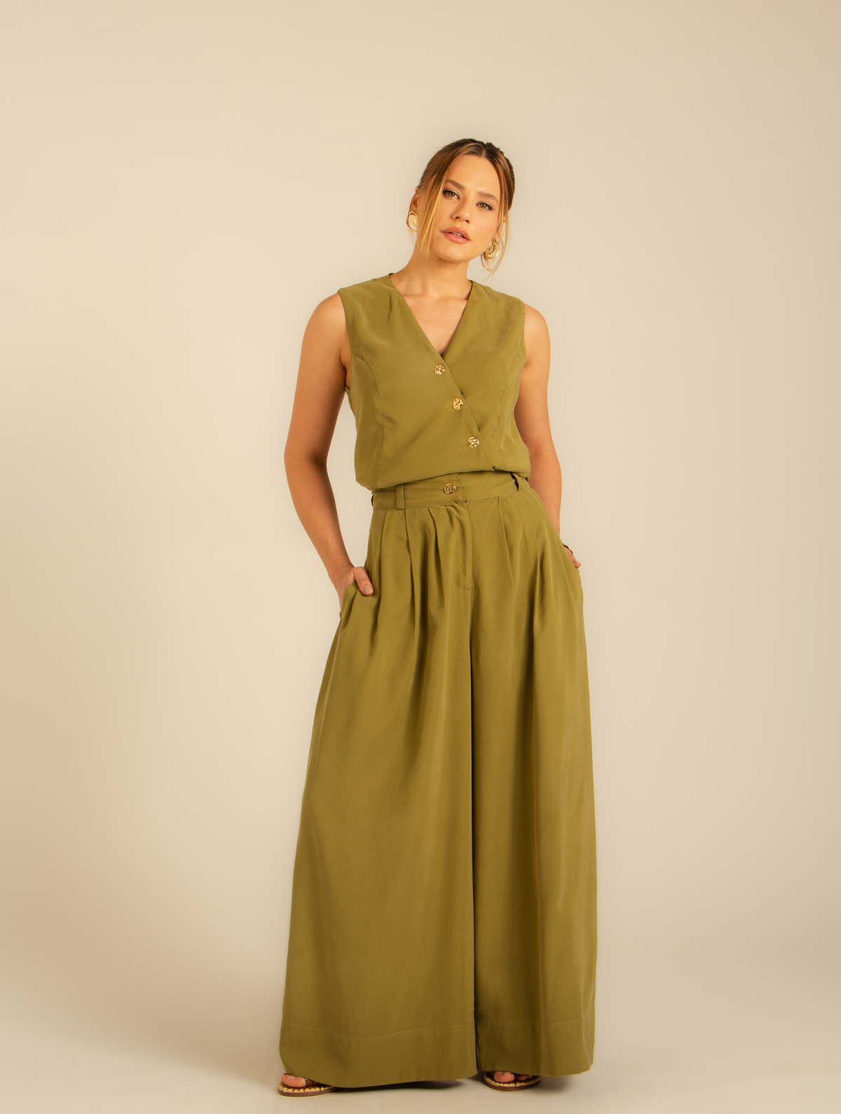 A Pantalona Euforia é confeccionada em Alfaiataria de viscose. A Pantalona possui cintura colocada fechamento com botões, zíper frontal e vista. Bolsos faca com forro de cetim e pregas frontais.