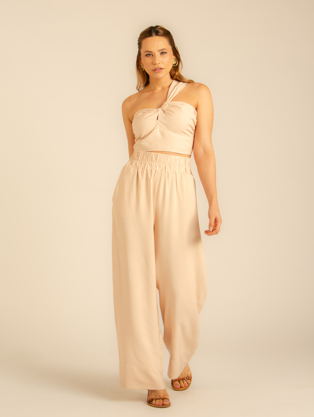 A Pantalona Vibração é confeccionada em Alfaiataria de viscose. A Pantalona possui cós largo com elástico trabalhado.