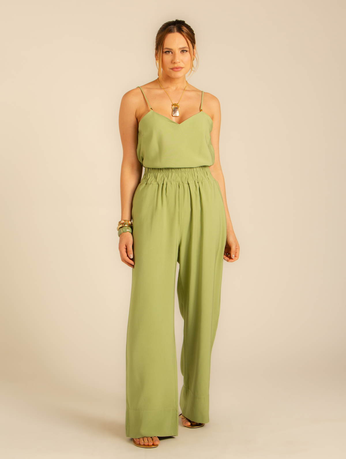 A Pantalona Vibração é confeccionada em Alfaiataria de viscose. A Pantalona possui cós largo com elástico trabalhado.