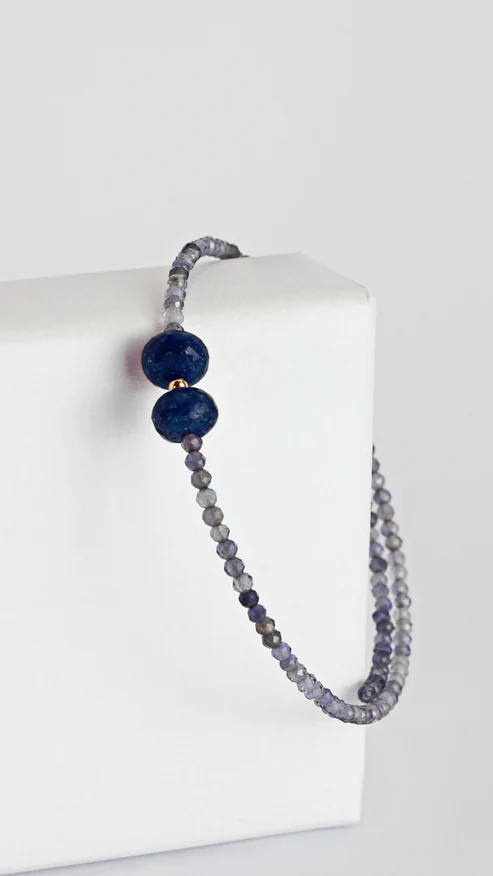 Pulseira de 1 volta com Iolita, 2 Safiras e 1 esfera em Ouro amarelo 18k.