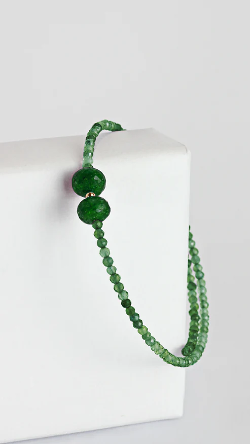 Pulseira de 1 volta com Jade verde, 2 Esmeraldas e 1 esfera em Ouro amarelo 18k.