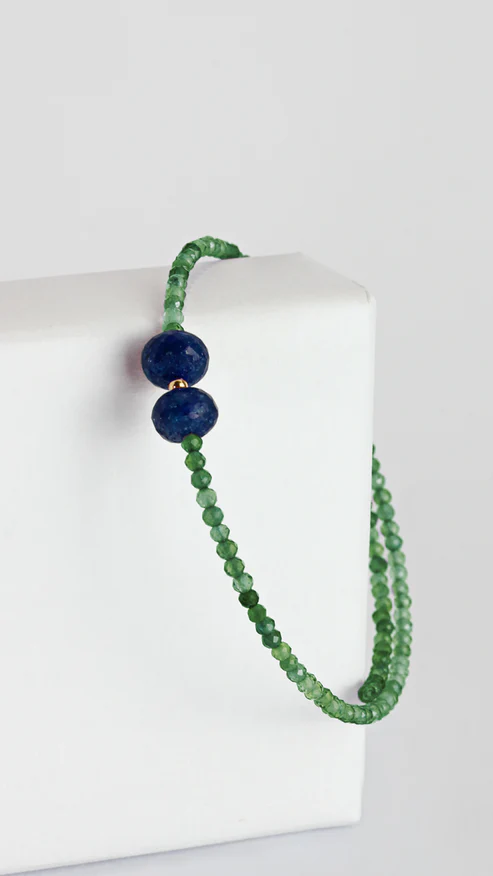 Pulseira de 1 volta com Jade verde, 2 Safiras e 1 esfera em Ouro amarelo 18k.