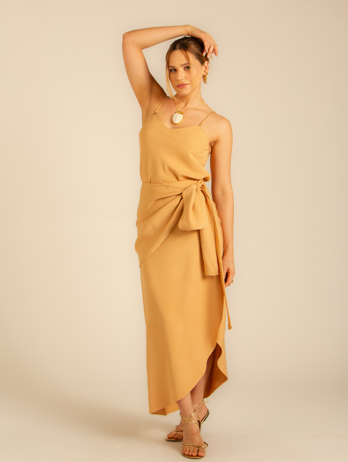 A Regata Calmaria é confeccionada em Alfaiataria de viscose. A Regata possui alça em rolotê com aplicação de mini tubos de metal. Decote suave em V e revel interno na altura do busto.