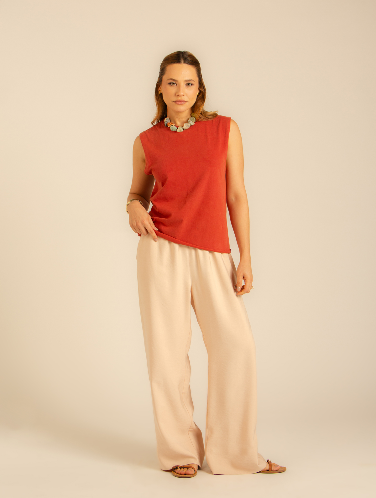 A Regata Energia é confeccionado em Malha 100% algodão. A Regata possui gola em galão, mangas cavadas, barra larga e recorte central nas costas.