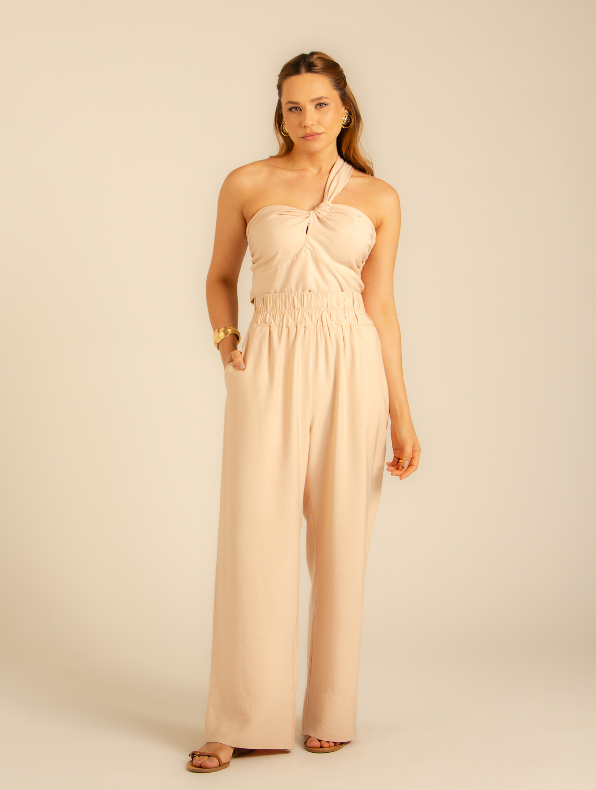 O Top Vibração é confeccionado em Alfaiataria de viscose. O Top possui alça faixa ajustada no decote e fechamento costas por zíper de metal. O busto contém abertura e franzido nas laterais.