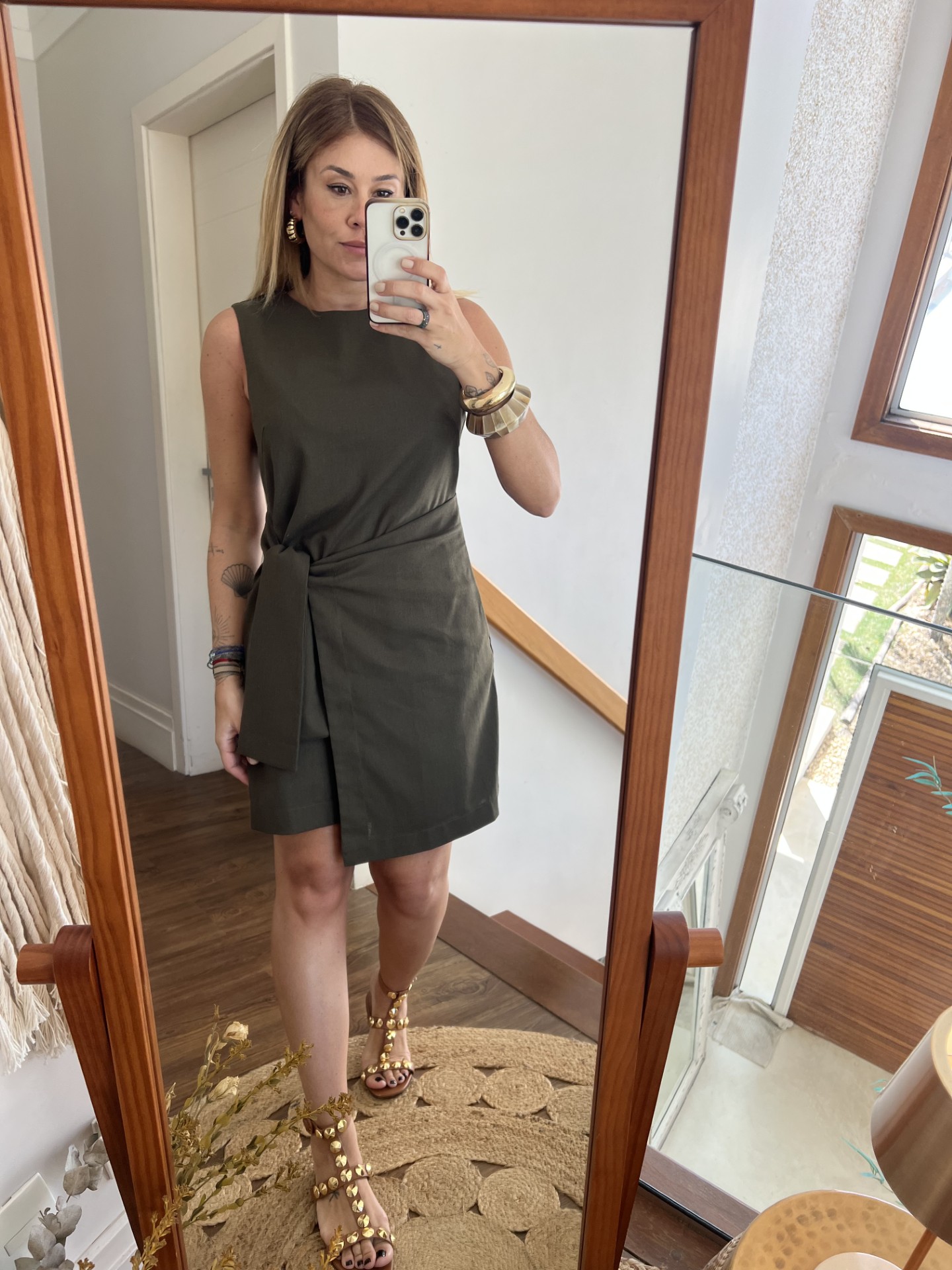 Vestido curto com transpasse assimétrico e faixa para amarração.