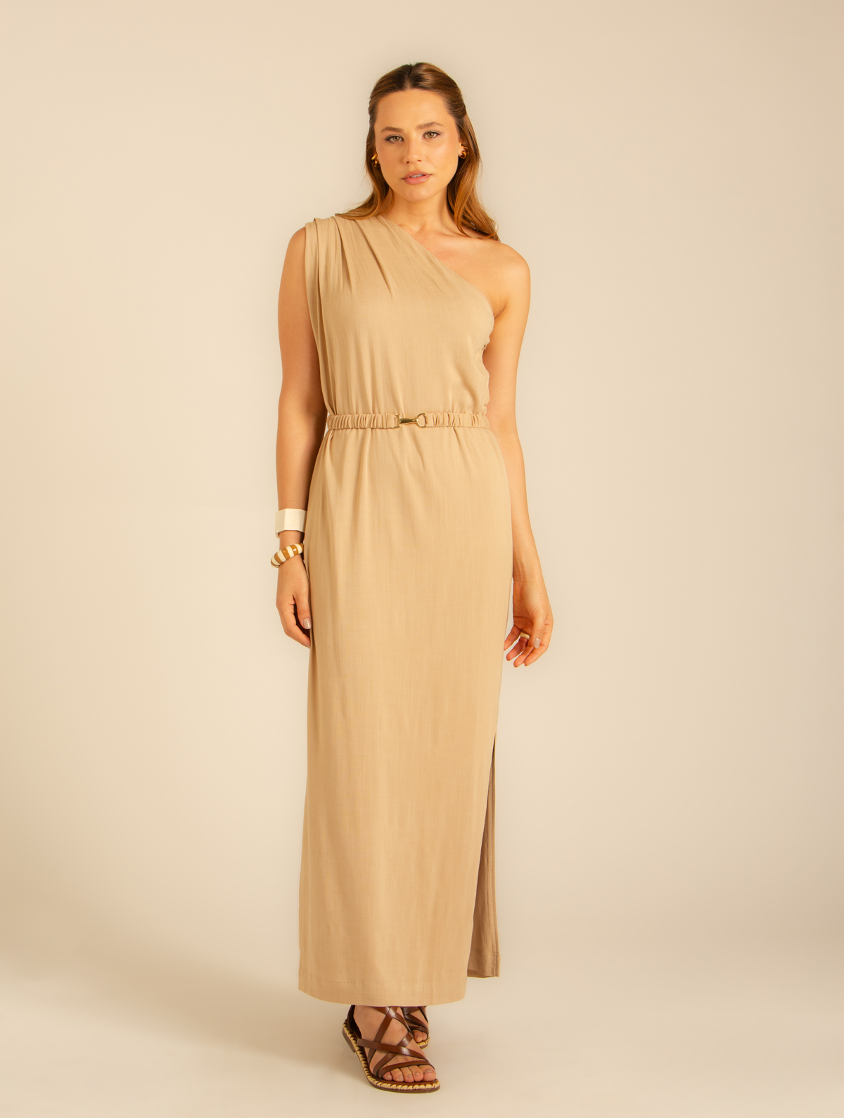 O Vestido Virtude é confeccionado em Viscose Mista. O Vestido possui ombro só com pregas localizadas frente e costas. Fechamento com zíper, fendas laterais e forro interno de cetim com elastano.